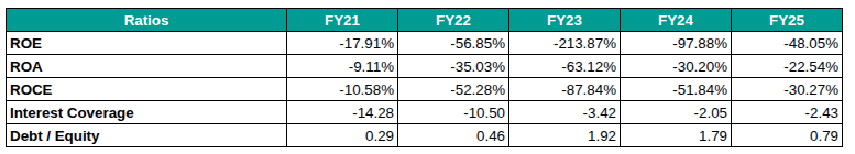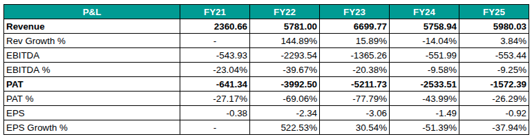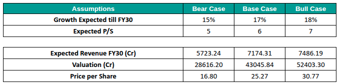 According to these assumptions, the FY30 revenue is estimated at 5723-7486 Cr meaning that the valuation may vary between 28616-52403 Cr and per share will be 16.80-30.77. Long-term growth visibility is further supported by the fact that the EBITDA and PAT losses show a steady decrease.