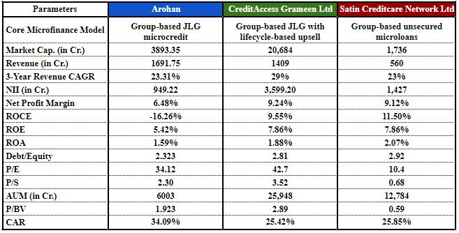 - As a measure of value, Arohan's price-to-earnings ratio (P/E) of 34.12 and price-to-book ratio (P/B) of 1.92 put it right in the middle between those of CreditAccess, which has high multiples, and Satin, which has low multiples, which reflects the market's expectations for margin expansion and a normalizing rate of growth. Arohan has a strong capital cushion, an improving growth rate, and an operating model based on technology, making it an alternative to being an emerging compounder in the non-banking financial company (NBFC) microfinance industry (MFI).