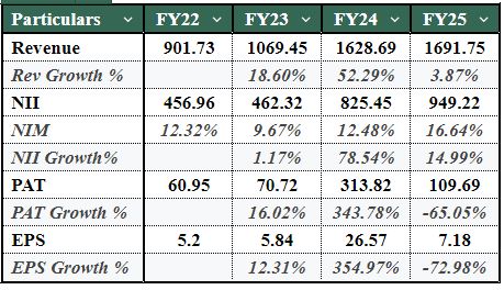 - In FY25, PAT decreased sharply, as many headwinds came together to halt growth, keep fixed operating costs intact, and take a more conservative approach to provisioning and compliance costs. A self-imposed cap on margins reduced any additional upside from a pricing standpoint, and the increased level of equity diluted return ratios. These contributing factors compressed profitability, but there were no signs of degradation of asset quality.