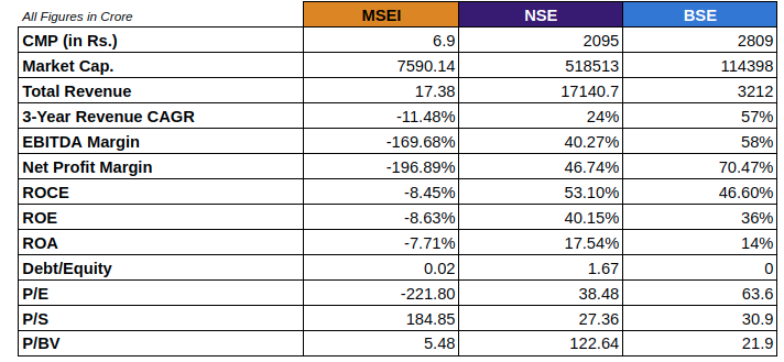 • Clean Balance Sheet: Debt/Equity only 0.02 (almost debt-free) provided MSEI with financial flexibility as compared to 1.67x leverage of NSE.