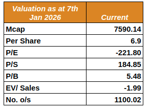 • P/S Multiple Used (160 to 170x): This was chosen because earnings are currently negative, while sales are increasing. The P/S ratio is more suitable for early-stage or turnaround businesses that show visible top-line growth.
