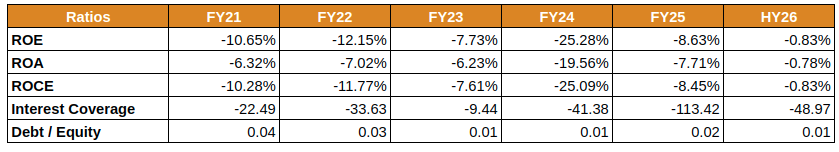 • Deep Losses to Near Break-even: ROE, ROA and ROCE plummeted in FY24 (~ -25) and then soared to an approximate of -0.8% in HY26 indicating a turnaround phase.