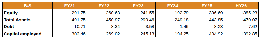 • Low Debt Profile: Debt was low in years, decreasing to ₹1.46 cr in FY24, and only ₹7.62 cr in HY26, which is indicative of a debt-free position.