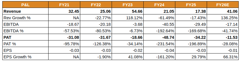 • The net losses have continued to increase year after year and PAT is projected to increase to -11.53 crore in FY26 against -48.74 crore in FY24. EPS remains negative as it is likely to be positive to -0.01 in FY26.