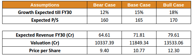 • Valuation Outcome by FY30: Revenue is projected to be ₹64.6 to 79.6 Cr, leading to a valuation of ₹10,337 to 13,533 Cr and a price per share of ₹9.40 to 12.30 under different market scenarios.
