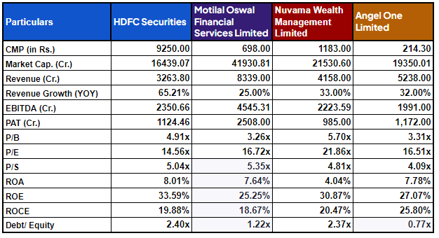 HSL is benchmarked against three listed peers: Motilal Oswal Financial Services, a full-service business; Nuvama Wealth Management, a capital-light advisory business; and Angel One, a mass-market discount business, which have structurally different business models.