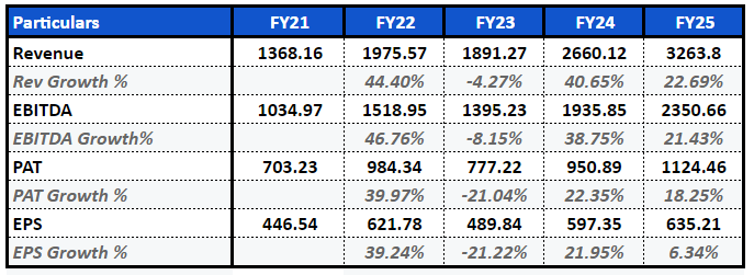EPS reached a high of ₹622 in FY22, plummeted to ₹490 in FY23, and then recovered to a new all-time high of ₹635 in FY25. The low growth of 6.34% in EPS in FY25, despite 18% growth in PAT, is because of the issue of fresh equity shares in FY24, where there was a dilution of earnings per share, as fresh shares were issued to expand the balance sheet.