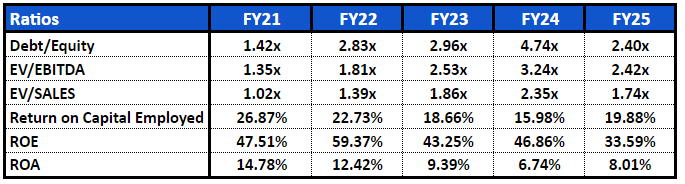 A five-year increase in EV/EBITDA from 1.35x to 2.42x shows the market’s steady re-rating of this company – investors are now willing to pay more for every rupee of operating profit, a testament to the new business model.