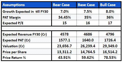 At a multiple of 14.56x, the lowest in the peer group but with the highest revenue growth and ROE, HSL is fair value to modestly undervalued from a quality perspective. For a long-term investor with a 3-5 year horizon, the base case generates a price return of 59.6% to a price of ₹14,765. This share is available with sharescart.