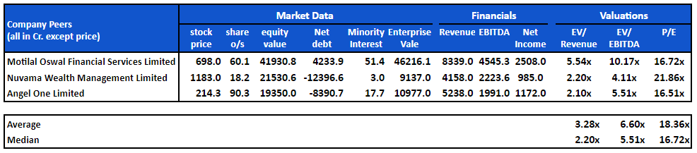 The ₹4,192 floor is almost certainly an underestimate. It's based on an EV/Revenue multiple that's been dragged down by Nuvama and Angel One's business models. If we simply use the Motilal Oswal multiple of 5.54x, the implied valuation based on the EV/Revenue metric will jump substantially and much more closely approximate the EV/EBITDA-based valuation of ₹6,897.