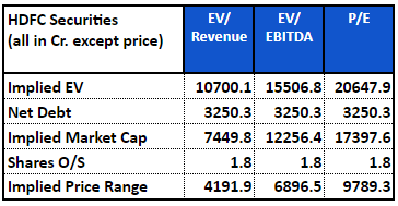 The P/E-based valuation of ₹9,789 represents the ceiling. And at the current price of ₹9,250 per share at HDFC Securities, the company is essentially trading at the upper limit of the valuation range based on its peers’ valuations.