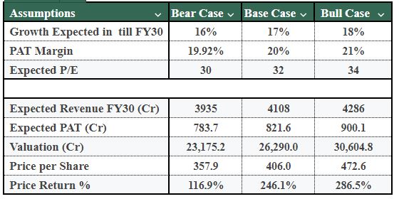 The projected income statements for FY2030 have been created using conservative-to-aggressive scenarios, with three main assumptions included within those scenarios: revenue growth, PAT margins, and valuation multiples.