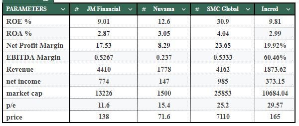 InCred uses metrics that compare other companies against them in terms of profitability, growth, and valuation. While Incred's Return on Equity (ROE) at 8.81% and Return on Assets (ROA) at 2.98% place them between SMC and JM (better than JM but below Nuvama), Incred clearly dominates the field when it comes to efficiency with an EBITDA margin of 60.46%, demonstrating better cost control, greater operating leverage and a strong lending portfolio. In terms of competitiveness, Incred also has a competitive net profit margin of 19.82% which is again ahead of most of its competitors.