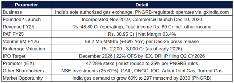 Indian Gas Exchange Limited (IGX) is India’s first and only PNGRB-authorized natural gas trading exchange — a regulatory monopoly sitting at the intersection of India’s energy transition and accelerating gas demand. With a 63.4% net margin, zero debt, ₹251 Cr cash pool, and an IPO expected before December 2026, IGX is transitioning from an early-stage platform into a structurally superior exchange business. The upcoming IPO at ₹2,200–3,000 Cr represents fair pricing on trailing metrics but is justified on forward earnings given 30%+ PAT CAGR visibility and India’s gas market set to grow 60% by 2030.