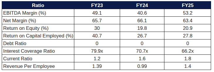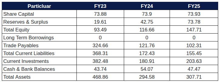 Zero long-term debt. Net fixed assets of just ₹5.98 Cr confirm the asset-light, software-economics nature of the platform. Equity has grown consistently from ₹63.55 Cr in FY21 to ₹147.71 Cr in FY25 — entirely driven by retained profits. The ₹251 Cr cash and investment pool generates ~₹20 Cr/year in other income, a perpetual compounding engine.