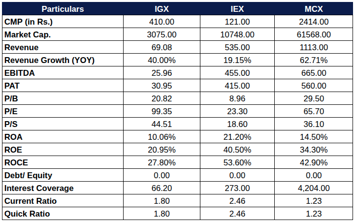 To contextualize IGX's valuation and growth profile, a comparison with its closest listed peers — IEX (Indian Energy Exchange, also its parent/promoter) and MCX (Multi Commodity Exchange) — is instructive. Both are mature listed exchange businesses; IGX is the growth-stage outlier.