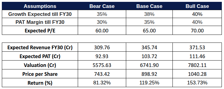 Assuming 35–40% revenue CAGR through FY30 — supported by historical growth, strong FY26 volume momentum, and structural demand tailwinds — here are the modelled outcomes with P/E normalization to 60–70x post-IPO, aligning with listed exchange comps.