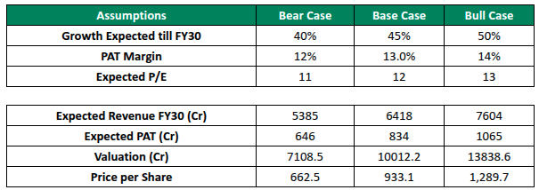 With ONIX trading at just 8.9× P/E whereas industry multiples are 35–45×, the stock has clear high growth potential. FY30 assumptions of 11–13× P/E imply a valuation range of ₹7,100–13,800 crore, translating to a possible price of ₹660–1,290 per share, making ONIX a high-growth, high-upside renewable opportunity.