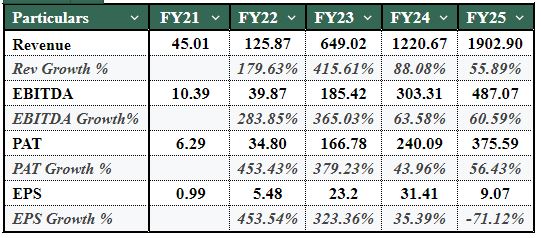 - Polymatech Electronics Limited has seen exceptional top-line revenue growth between the years of financial year FY2022 and FY2024 as a result of growing through scale expansion. From a relatively minor component manufacturing facility, Polymatech has transitioned to being a large semiconductor manufacturer in almost two years. From FY2022 to FY2024, revenue from operations rose from ₹126 crore to ₹1,221 crore – almost a tenfold increase in just two years. The primary driving force behind this explosive growth was the high volume of global demand for semiconductors and LED-related products, combined with the rapid expansion of their manufacturing facilities, the introduction of higher value products such as wafers, sapphire ingots and advanced semiconductor components into their portfolio of offerings, and increased cooperation with the OEM and export-based supply chains. Collectively, this period of time shows hyper-growth driven by the scale-up rather than an organic growth pattern.
