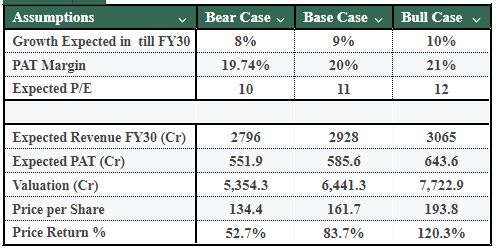 - Value per Share: The valuations translate into estimated per share prices of ₹134.4 (bear), ₹161.7 (base), and ₹193.8 (bull)—illustrating the sensitivity of equity value to small changes in growth, PAT margins, and valuation multiples within the range of valuations.