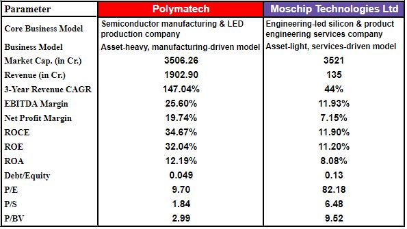 - MosChip Technologies Limited and Polymatech both compete within the same semiconductor value chain. However, they are positioned within the value chain in entirely different segments. They have different business models as well (i.e., Polymatech is an asset-intensive model in semiconductor manufacturing and LED production, while MosChip operates with a low asset base, engineer-driven model in silicon and product engineering).Due to these two unique positions, the two companies have a fundamental divergence in growth, profit margins, capital efficiency, and financial metrics (valuation).