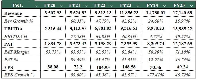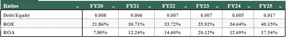 2. PAT Margin: We have modelled a PAT margin on a historical basis from FY20 to FY25 of ~70%, which we expect will slightly improve, reflecting higher operating leverage and efficiency.